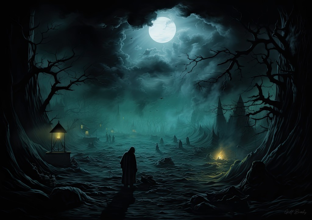 The moon, radiant and full, cast an otherworldly glow upon the desolate landscape. Whispering winds rustled the leaves, creating an eerie symphony sending shivers down the spines of those who dared to wander outside.