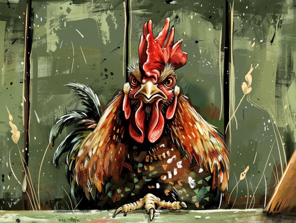 The other farm animals often joked that Grumpy must have woken up on the wrong side of the roost as he would strut around the farmyard, squawking and pecking at anyone who dared to come too close. His feathers were always ruffled, and his eyes glared fiercely, making even the bravest of hens think twice before crossing his path. Despite his grumpy demeanour, Grumpy was a beloved member of the farm, as his crowing served as the alarm clock for everyone to start their day.