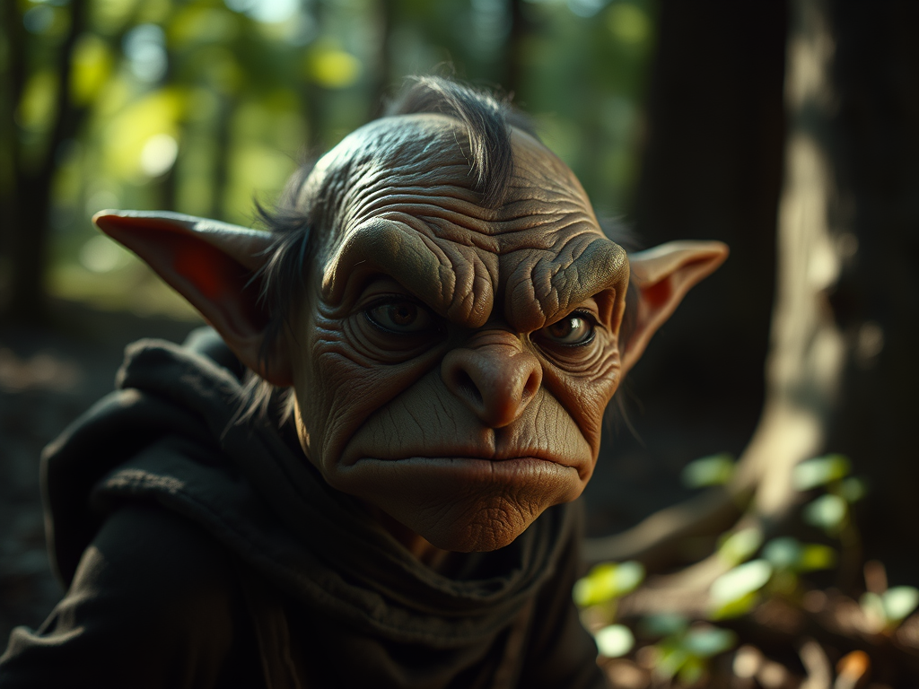 Once upon a time, a goblin named Grumble lived in the mystical land of Doria. Grumble was unlike any other goblin in the land. While goblins were known for their mischievous nature and love for causing trouble, Grumble was always unhappy. His face was constantly twisted into a frown, and his eyes were always filled with sadness. Grumble lived in a small cave at the edge of a Dark Forest, far away from the other goblins in the village. He spent his days wandering through the forest, grumbling to himself about how unfair life was. While the other goblins spent their days playing pranks and laughing, Grumble preferred to be alone, lost in his thoughts.