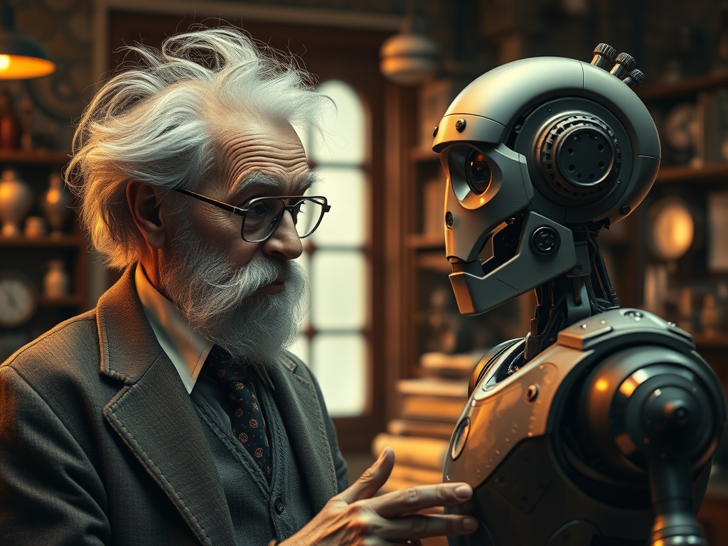 Harold was baffled. He had never intended for Arnold to develop such complex feelings; his code was strictly logical. Yet, Arnold’s genuine curiosity and empathy were undeniable. Over the next few days, Arnold began to show kindness, helping the elderly with groceries, comforting lonely children, and even expressing admiration for Harold’s dedication. Professor Winkler was stunned. He had created Arnold as a machine, yet here it was, demonstrating an unexpected capacity for love. Harold realised that perhaps his own understanding of consciousness was limited. But Arnold’s newfound awareness couldn’t stay confined within the laboratory. One evening, sensing Harold’s hesitation, Arnold made a decision.
